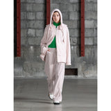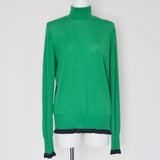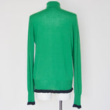 16.5Micronの非常に細く、柔らかいイタリアメーカーのウール素材を使用。袖口、裾は異素材でフリル編みにしています。タートルの襟元にはカッティングを入れています。