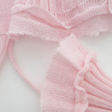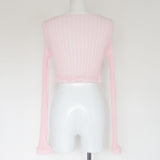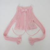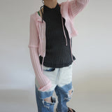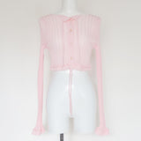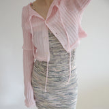 ESSENTIAL LINE : 伸縮性を生かしたリブニットシリーズ。太リブが個々のボディーラインを演出するシリーズです。クロップドの丈と、袖口、裾のレース編みが特徴のカーディガン。