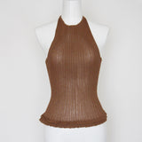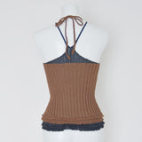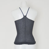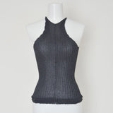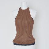 伸縮性を生かしたリブニットシリーズ。太リブが個々のボディーラインを演出するシリーズです。インナーとしても着用できる、クルーネックタイプ。袖口、裾はレース編みになっています。