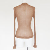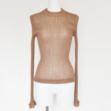 伸縮性を生かしたリブニットシリーズ。太リブが個々のボディーラインを演出するシリーズです。インナーとしても着用できる、クルーネックタイプ。袖口、裾はレース編みになっています。