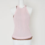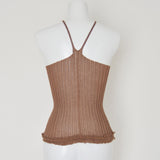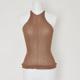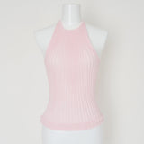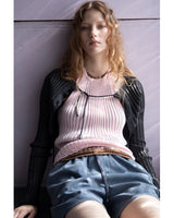 伸縮性を生かしたリブニットシリーズ。太リブが個々のボディーラインを演出するシリーズです。インナーとしても着用できる、クルーネックタイプ。袖口、裾はレース編みになっています。