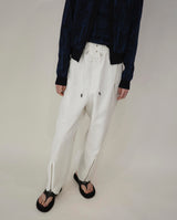 撥水素材を使用しています。見た目よりも驚くほど軽く、しなやかな素材です。ミリタリーのパンツを元にデザインをしました。裾はファスナー開きの仕様になっていて、開くとストレートラインのパンツになります。ウエストはゴム仕様になっていて、更にヒモで調節が可能です。