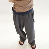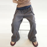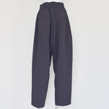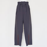 撥水素材を使用しています。見た目よりも驚くほど軽く、しなやかな素材です。ミリタリーのパンツを元にデザインをしました。裾はファスナー開きの仕様になっていて、開くとストレートラインのパンツになります。ウエストはゴム仕様になっていて、更にヒモで調節が可能です。