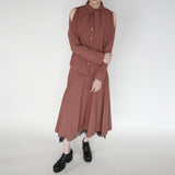 マットな質感のポリエステルを使用。たっぷりとしたフレアのシルエット。裏地にレースをドッキングさせ、裾から配色のレースが見えるデザイン。