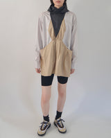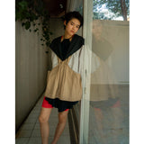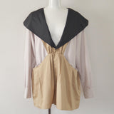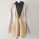 リサイクルポリエステルの撥水素材を使用しています。薄地で光沢感が特徴の素材です。ボディーラインをなぞる切り替えが特徴のデザインです。セーラーカラーはボタンで留めて着用も可能です。見頃の切り替えを利用した大きなポケットも特徴です。