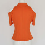 愛知県で編まれた、光沢感のあるジャージ素材を使用。肩には大きな穴があいています。ボディーラインを綺麗に見せるカッティングが特徴の一枚。