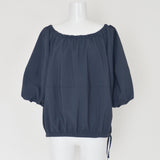 The shirt is made of polyester, which has a dry, linen-like feel. It is wrinkle-resistant and washable. It has a balloon silhouette, and the collar and hem can be tightened with strings to change the silhouette.